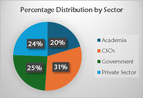 Sector-wise, the participants were distributed across Academia (107), Civil Society Organizations (161), Government (128), and Private Sector organizations (128), reflecting a diverse and representative sample of the program’s stakeholders.